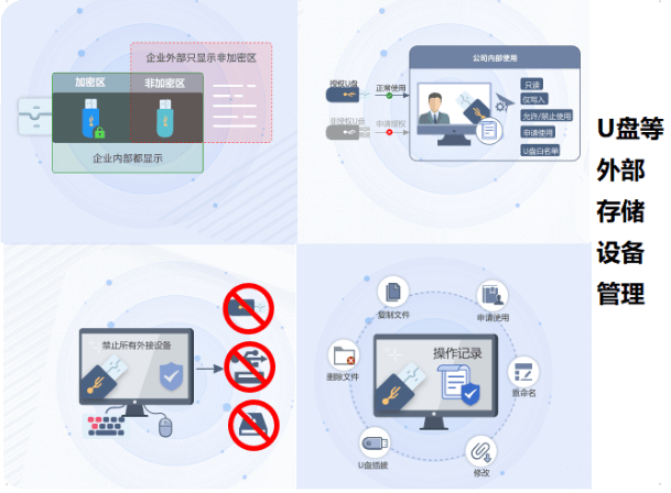 - USB存储控制:对USB存储进行控制,设置禁止U盘拷贝文件,或根据需要设置写入U盘需提交申请,用户只能读取文件而不能进行写入或拷贝操作。