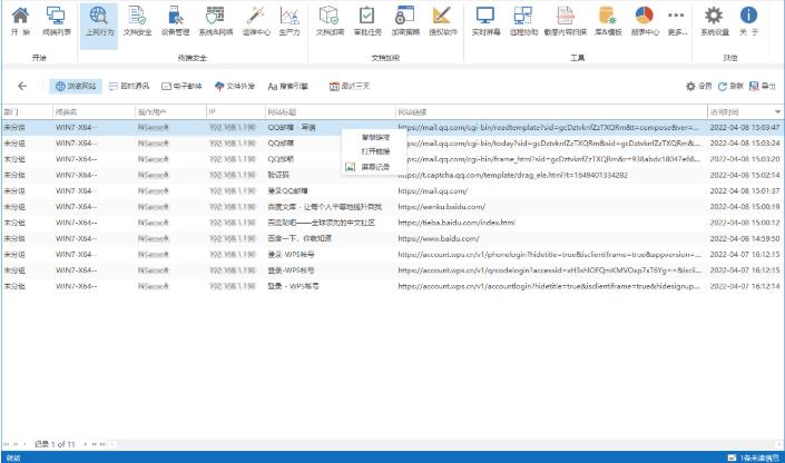 上网行为管理:记录员工的网站浏览记录、搜索记录等,支持设置网站黑白名单,限制员工访问不适当网站。