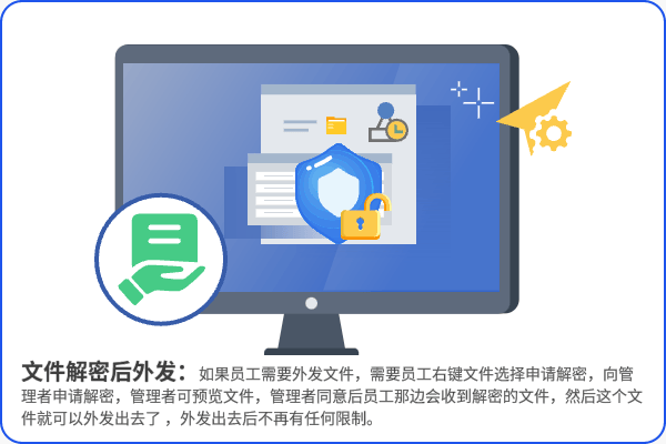 - 外发权限管控:如果员工需要外发文件,需要员工右键文件选择申请解密,向管理者申请解密,管理者可预览文件,管理者同意后员工那边会收到解密的文件,然后这个文件就可以外发出去了 ,外发出去后不再有任何限制。