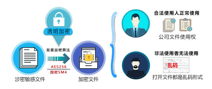 - 文件加密:采用国密算法对公司的重要业务文件(如客户资料、报价单、合同模板等)进行透明加密处理,员工在公司内部正常使用时可以自动解密,但一旦文件被复制到外部设备或未经授权的环境中,就会显示为乱码,防止员工将关键资料带出公司用于飞单。