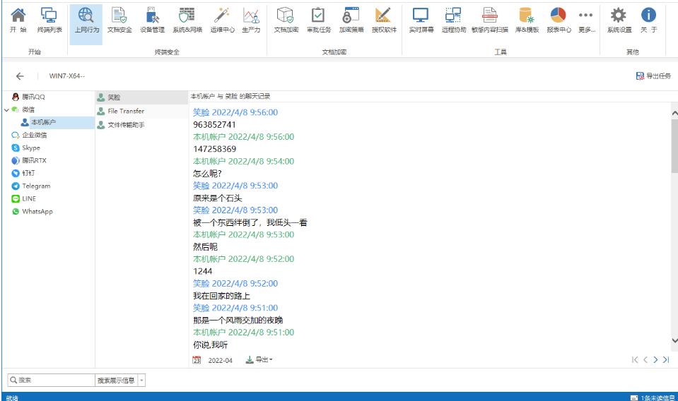 即时通讯与邮件监控:安固软件能够深度覆盖微信、QQ、钉钉等主流即时通讯工具以及企业邮箱,记录聊天记录、文件传输记录等。