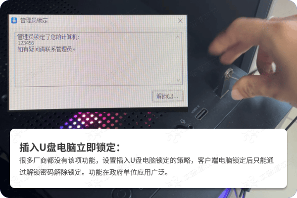 4.异常行为锁定:一旦发现未经授权的U盘插入或异常的文件拷贝行为,会自动立即锁定电脑,并通知管理员进行处理。