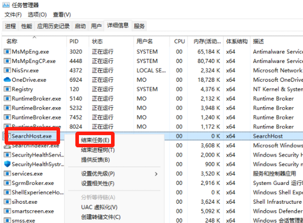我们打开任务管理器,点击“详细信息”,在其中找到“SearchHost.exe”,右键单击并选择“结束任务”,在弹出的提示框中选择“结束进程”,它将自动重启。随后重新打开桌面搜索,查看可以是否正常使用。