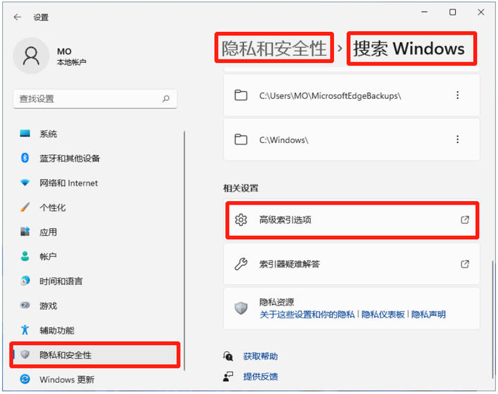 我们打开电脑设置,选择“隐私和安全性”,在右侧选择“搜索Windows”,随后选择“高级索引选项”。