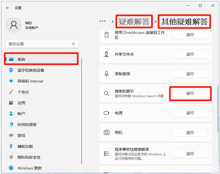 我们打开电脑设置,选择系统并在右侧选择“疑难解答”,随后选择“其他疑难解答”,再单击“搜索和索引”旁边的“运行”按钮。