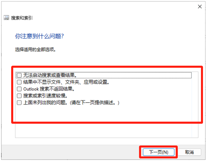 在搜索和索引窗口中,选择在使用搜索功能时遇到的问题,再单击“下一步”。如出现提示就进行相应的更改,随后查看搜索框是否可以正常使用。