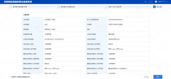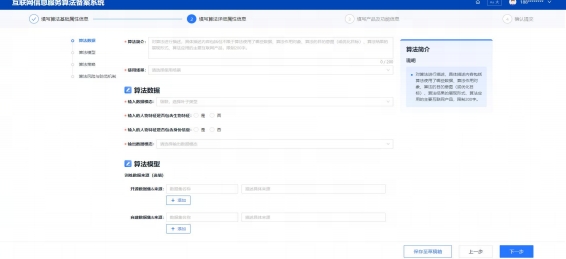 在产品及功能信息填报完成后,算法备案填报人员可点击主页的“备案信息”,进行算法信息填报。算法信息填报分为四个步骤: