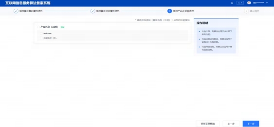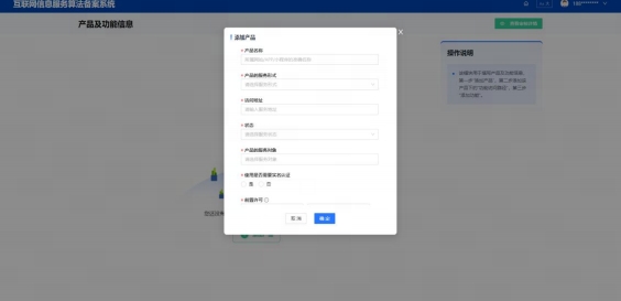 完成主体信息填报后,算法备案填报人员需点击主页的“产品及功能信息”,进行产品及功能信息填报。需依次添加产品信息、产品功能访问路径以及路径下的功能信息。添加时需参考页面右方的说明文字,根据实际情况进行填报。
