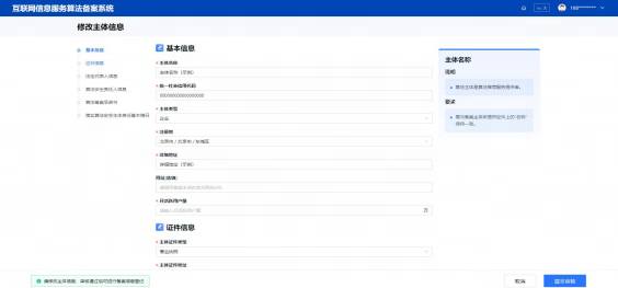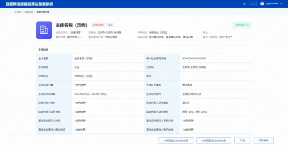 备案系统还支持备案变更及注销操作。若备案信息发生变化,备案主体可修改主体信息、算法信息及产品及功能信息,但需重新进行审核。若已完成备案的算法需注销,备案主体可在“备案信息”页面找到需注销的算法进行注销操作。