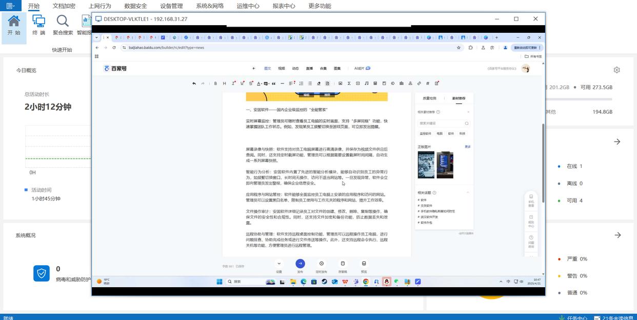 智能行为分析:安固软件内置了先进的智能分析模块,能够自动识别员工的异常行为,如频繁切换窗口、长时间无操作、访问不适当网站等。一旦发现异常,软件会立即向管理员发出警报,确保企业信息安全。