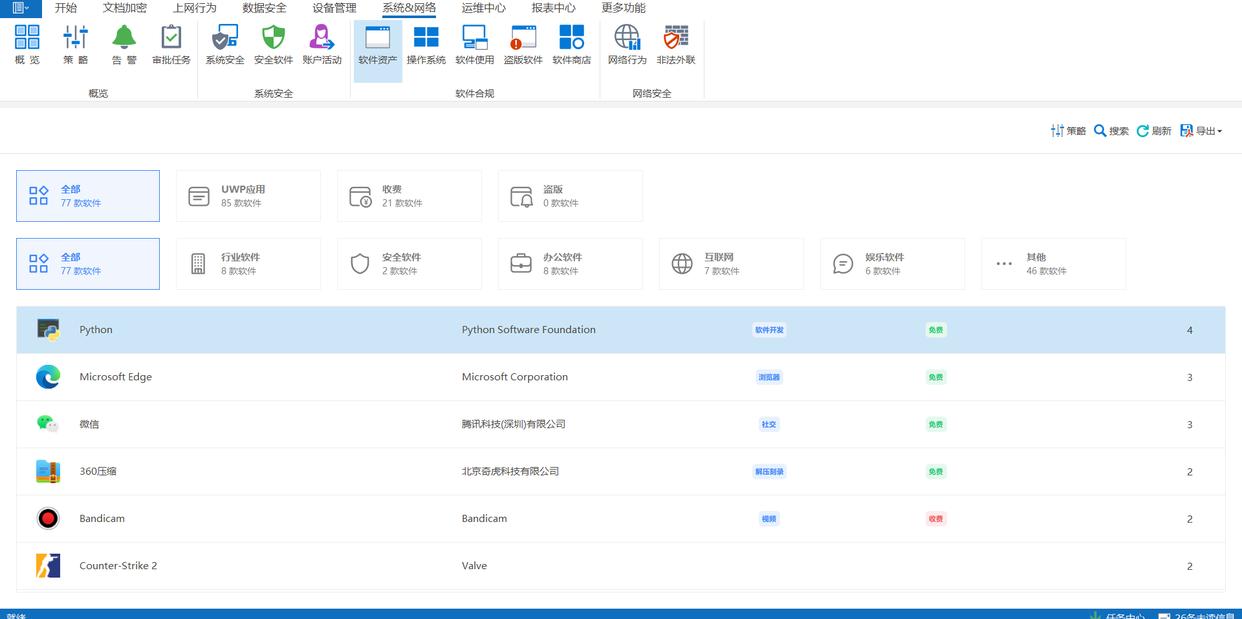 IT资产管理:自动发现、分类、跟踪企业内的所有IT资产,包括服务器、电脑、移动设备等。提供详细的电脑终端记录,帮助网管批量化进行管控,并能实时监测资产的变更情况,及时报警。