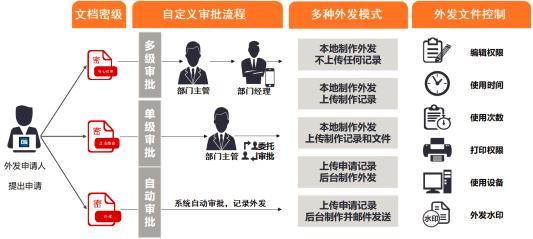 13. 外发文件限制:对于加密后的文件,外发需经过管理端提前审批,并且可设置文件的最大打开次数和外发次数,超过限制后文件自动加密;