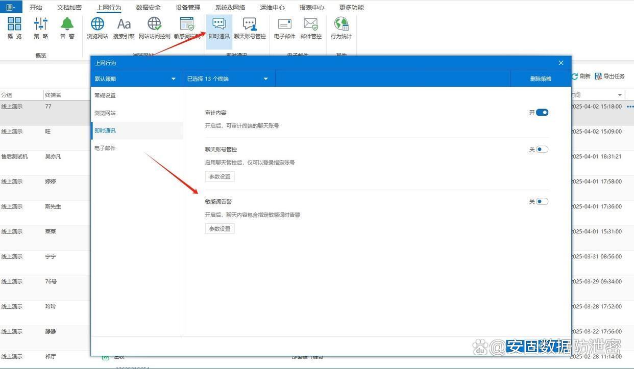 聊天内容监控:能对聊天软件进行监控,比如,微信、QQ、钉钉等软件。员工的聊天内容、聊天对象、收发文件情况都能被记录下来,能有效防止员工在聊天时不小心把公司机密说出去。