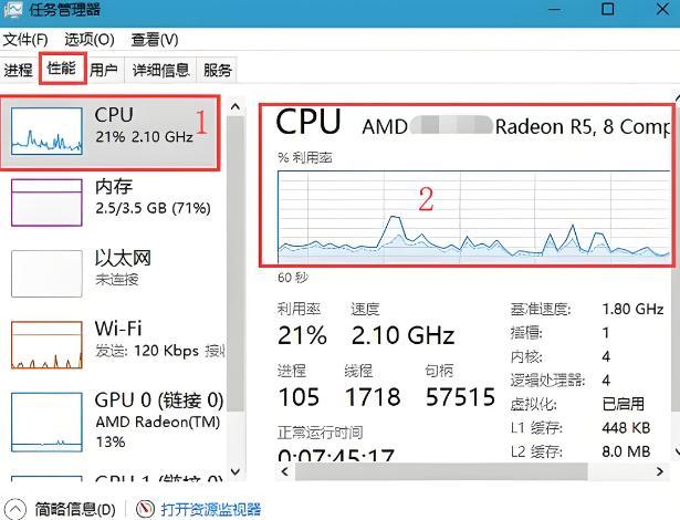 性能监控:切换到“性能”选项卡,监控CPU、内存、磁盘和网络的实时使用情况。