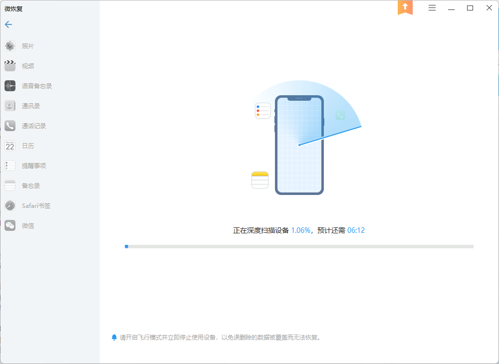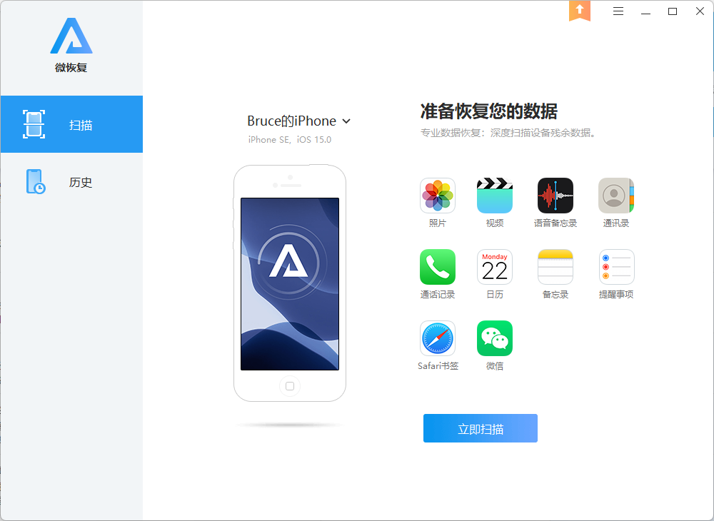 步骤三. 点击“立即扫描”,微恢复会深度扫描设备中的数据,并快速解析。为恢复已清空的聊天记录做数据准备。