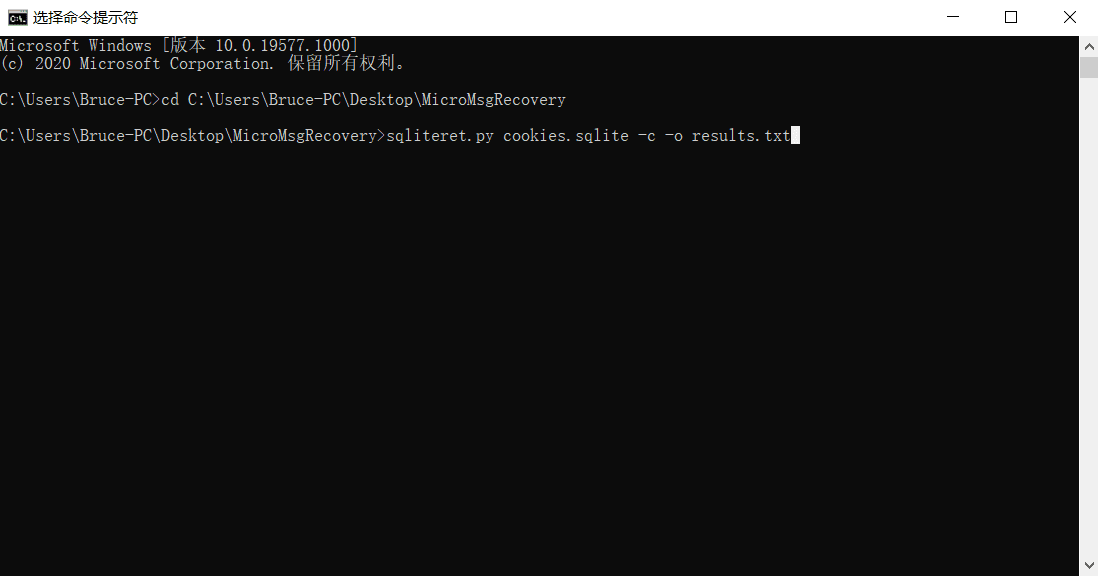 步骤三. 在“cmd”中先跳转到SQLiteRet目录,然后输入以下命令: