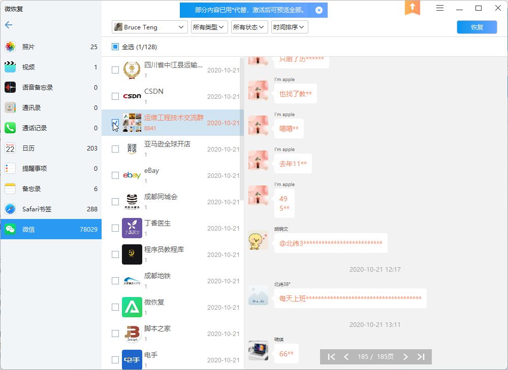 ◆ 支持多种数据类型,恢复微信删除的文字、图片、视频、语音、文件、红包、转账记录等。