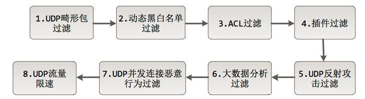 网络层防护的主要流程是:每50毫秒分析一次业务流程的成分、新建连接并发连接、业务请求,发现攻击成分发生变化时,依据客户的配置情况调用相应的清洗模块。网络层清洗模块主要有:TCP SYN认证模块、畸形包模块、ACL模块、TCP/UDP状态机模块、黑名单模块、大数据分析过滤模块、限速模块。NDS产品对UDP业务的防护流程如下图所示: