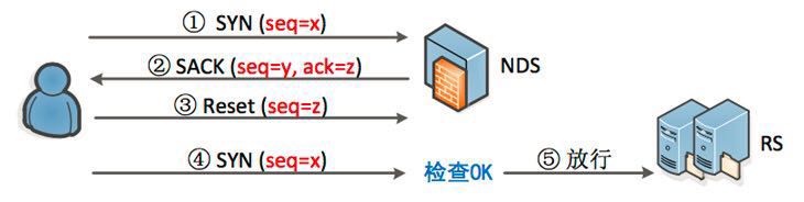 2、SYN Reset认证:用于过滤SYN Flood,成功率95%,源IP首次建TCP连接会延迟1-3秒;