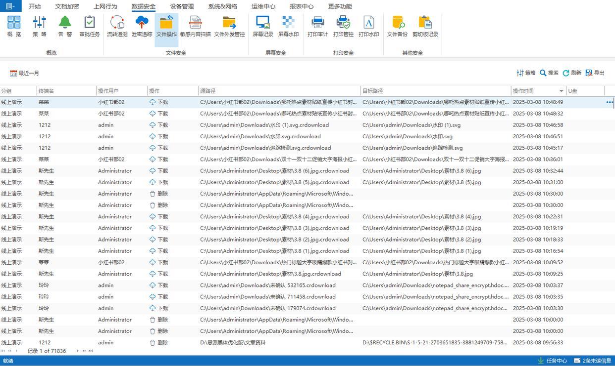 文件操作监控:详细记录员工对文件的操作行为,如创建、打开、修改、复制、移动、删除和重命名等,有助于企业了解文件的使用情况,防止文件被误操作或恶意删除,保障数据安全与规范操作。