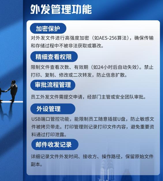 文档外发管控可以封堵常见的文档外发行为,比如:通过电子邮件、聊天软件、网盘等途径外发文件。
