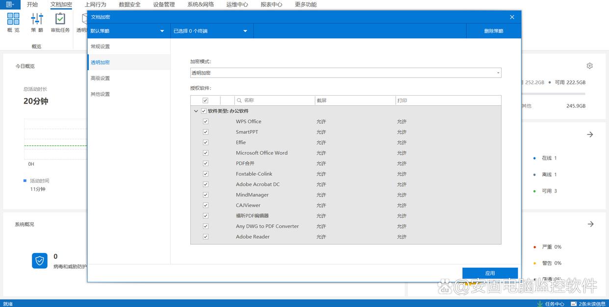 支持多种加密模式,如透明加密、智能加密、手动加密。权限控制精细,可具体到复制、打印、拖拽、截图等操作。还支持外发审批、加密网关控制及落地自动加密,保障数据在流转和保存过程中的全方位安全。