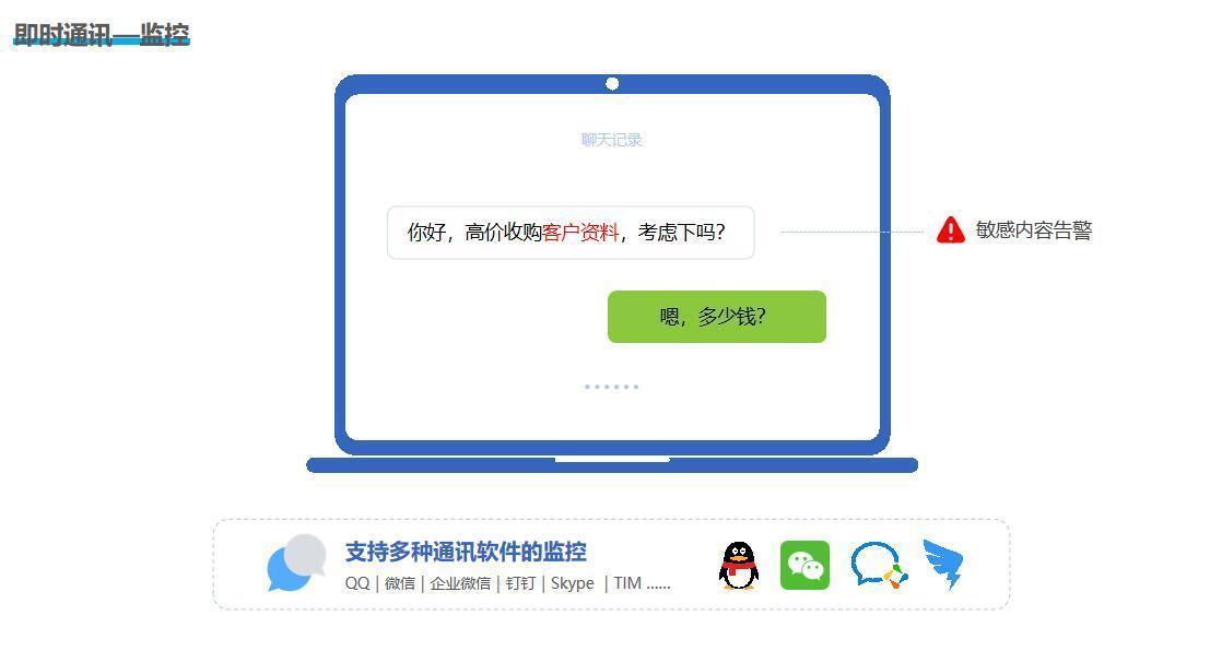 即时通讯监控:对微信、QQ、企业微信、钉钉等主流即时通讯软件的聊天记录进行监控,记录聊天内容、发送和接收的文件以及聊天时间等信息,防止公司信息通过即时通讯工具泄露。
