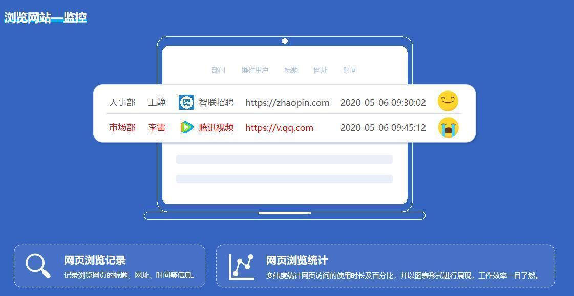 网站浏览监控:完整记录员工的网页浏览历史,包括访问的网站网址、访问时间和停留时长,支持设置网址黑名单,禁止员工访问与工作无关的网站,优化网络办公环境。