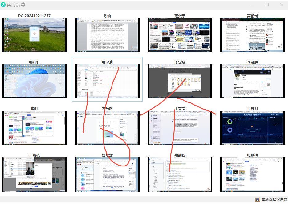 支持实时屏幕监控功能,允许管理员在管理界面实时查看员工电脑的屏幕画面。并且可以同时查看多个电脑屏幕,最多16个电脑屏幕同时查看。