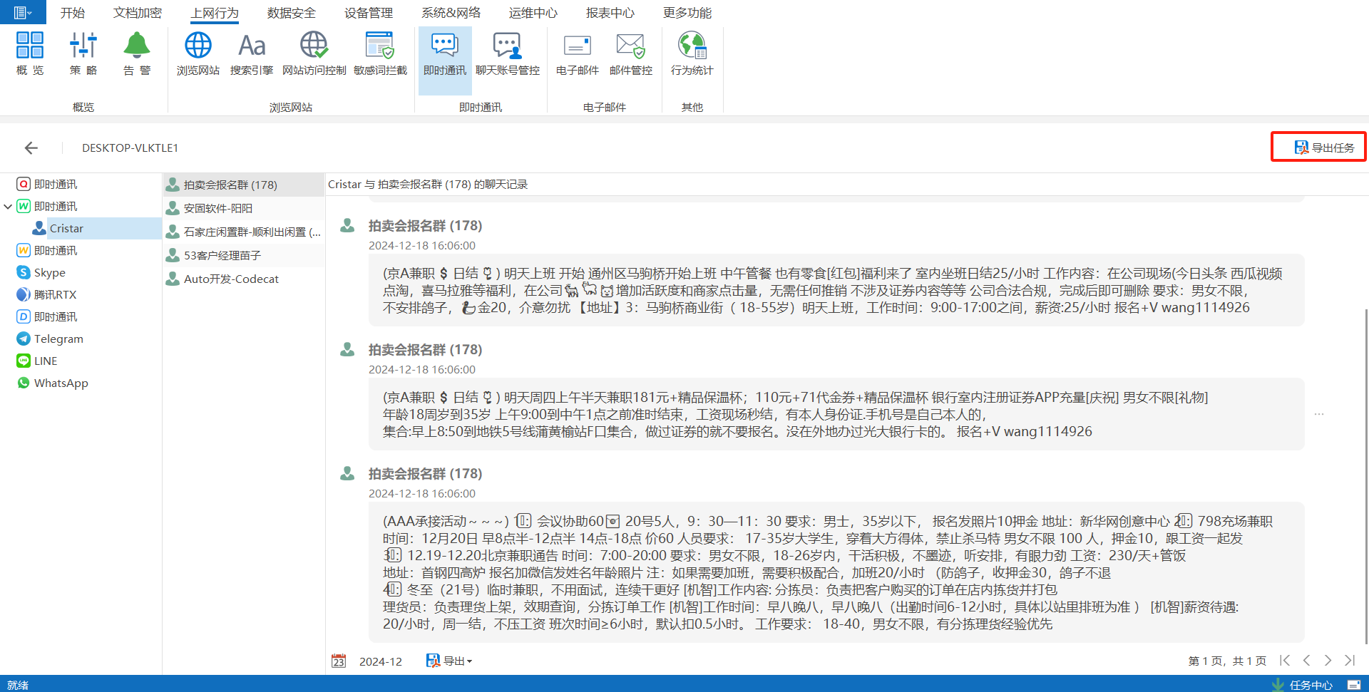 · 全面日志记录:详细记录每次聊天行为,包括发送时间、接收方、消息类型等;