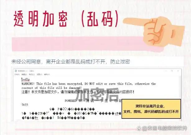 防泄露:通过透明加密、落地加密等技术,确保文件离开授信环境(如公司内网)后显示为乱码,即使被拷贝也无法读取。