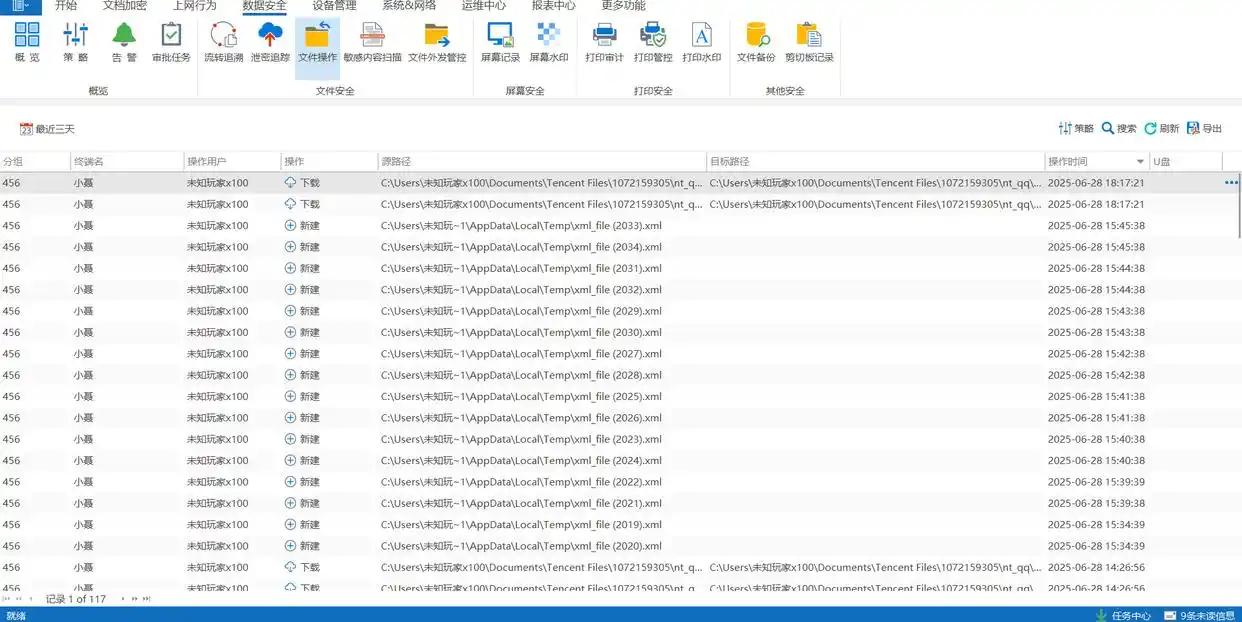 文档全生命周期追踪:记录文件创建、编辑、复制、删除等所有操作,支持按员工+时间+文件类型多维检索。