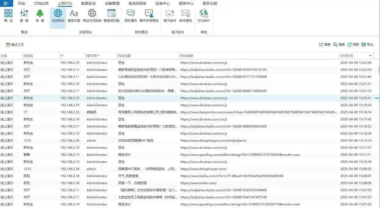 详细记录员工访问的网址、访问时间、停留时长等信息,企业可以根据这个记录,设置网站黑白名单,限制员工上网行为。