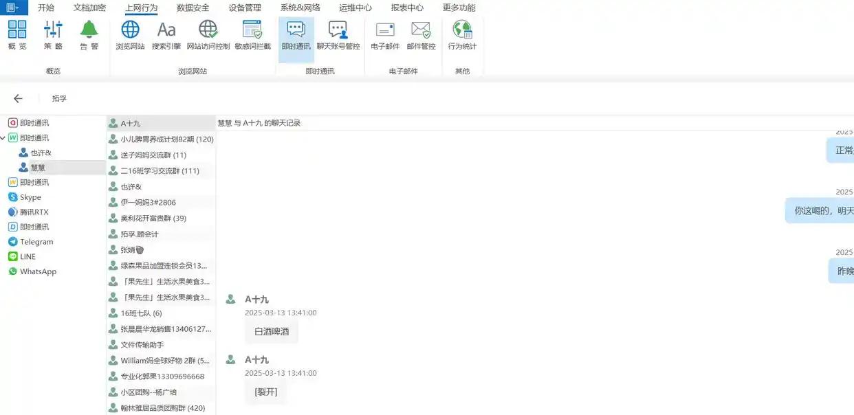 本软件可以详细记录员工各种软件聊天的内容、时间、对象等信息,并支持数据分析和导出,方便企业进行后续的审计和管理。