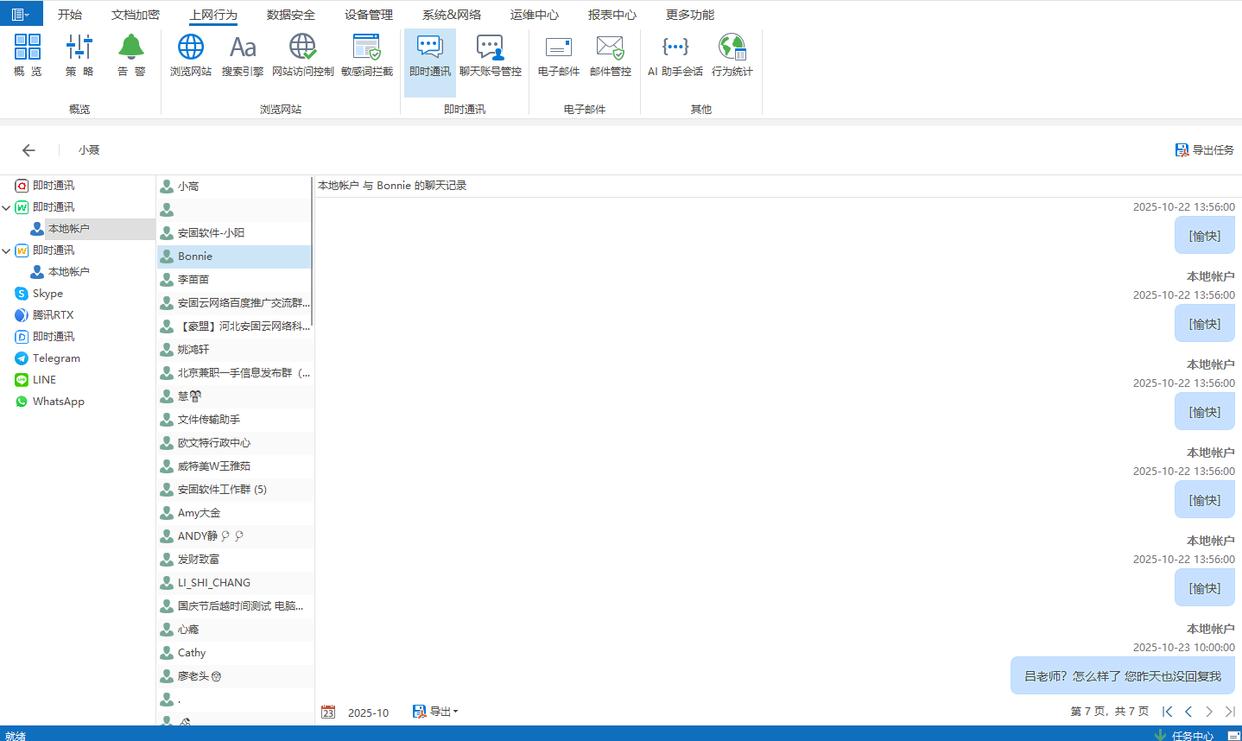 历史记录查阅:支持自定义范围搜索,方便管理者查看近七天、近一个月、近半年等的聊天记录。