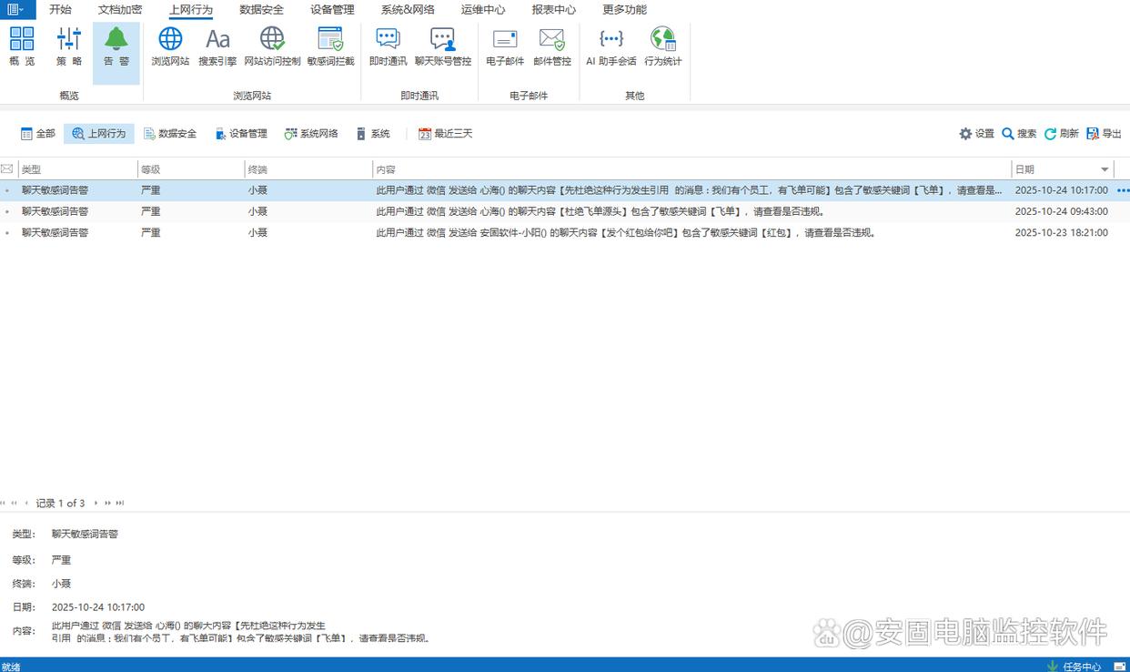 敏感词实时预警:企业能自定义敏感词库,比如 “商业机密”“客户数据”“内部文件” 等。一旦员工在聊天、邮件、搜索内容中出现这些敏感词,会立刻向管理员发出警报,及时阻止敏感信息泄露或违规行为。