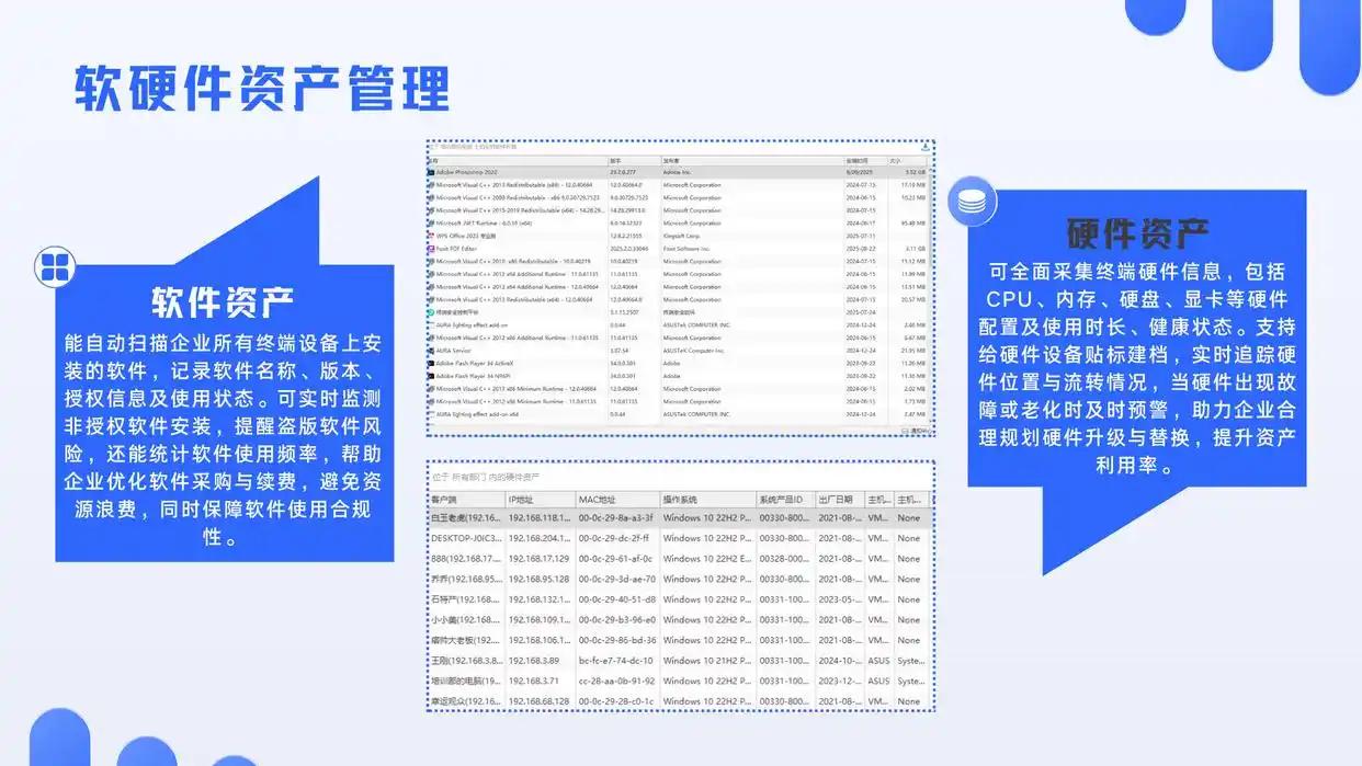 7.资产管理与远程协助:自动扫描并记录公司电脑的软硬件信息,形成资产台账,方便管理。当员工电脑出现问题时,IT人员可远程连接协助,快速解决问题,减少停机时间。