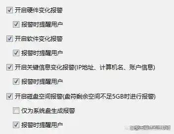 支持对硬件异动、磁盘空间不足、私自拆卸硬盘、软件变化、网络配置变更进行报警。