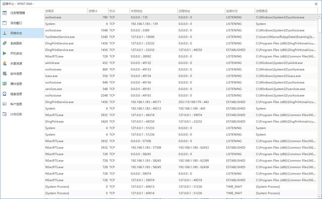 查看终端当前的网络状态,包含进程名,进程id,协议,本地地址,远程地址,连接状态以及进程路径。