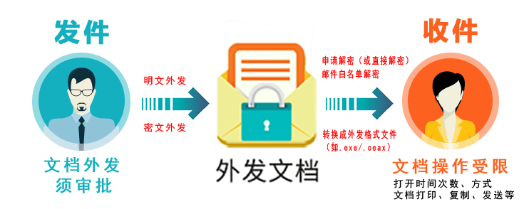 - 文件外发控制:通过外发审批策略,设定允许与禁止的邮箱,限制文件的外发对象,确保重要文件只能由特定人员和特定渠道进行外发。能够对外发的文件设置打开次数与有效期天数以及密码和打印权限等,实现外发的精细化管控。