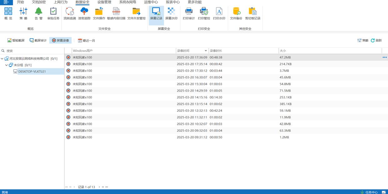 全面的行为审计:安固软件提供了详尽的行为审计功能,不仅可以监控员工的电脑活动,还能对所有操作进行录像回放。这意味着您可以轻松获取任何时间段内的具体操作详情,为后续调查提供坚实依据。