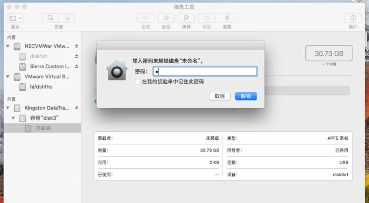 - 输入加密磁盘的密码并确认密码:密码同样建议具备一定强度,之后点击“抹掉”按钮开始对磁盘进行加密格式化操作,完成后磁盘内所有文档都处于加密状态,每次开机启动系统或者挂载该磁盘时需要输入密码解锁。