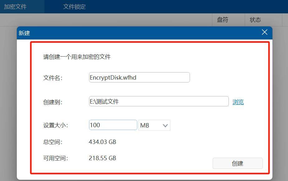 首选要新建一个加密文件,可以设置文件名、加密文件的路径、还有加密文件占用的大小。