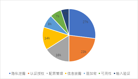 如下图所示,移动应用有41%的漏洞和缺陷由隐私信息泄露所导致。同时,OWASP发布的2016年十大移动安全威胁报告指出,十大威胁包括不恰当的平台使用、不安全数据存储、不安全网络通信、不安全的身份验证、不安全的加密策略、不安全的授权、客户端代码质量问题、代码篡改风险、逆向工程威胁和其他功能的威胁。