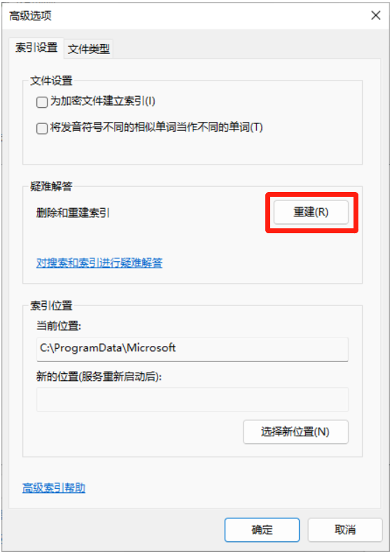 在索引选项窗口的底部,选择“高级”,在高级选项中单击“删除和重建索引”旁边的“重建”按钮。在弹出的提示框中选择“确定”,Windows现在将开始重建索引。等待完成后,查看搜索框是否可以正常使用。