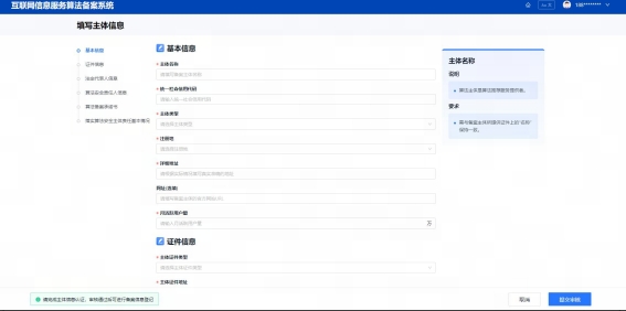登录备案系统后,算法备案填报人员需点击主页的“主体信息”,进行主体信息填报。需真实有效地填写备案主体信息,包括主体基本信息、证件信息、法定代表人信息、算法安全责任人信息等。同时,还需下载并填写《算法备案承诺书》和《落实算法安全主体责任基本情况》附件,并打印加盖公章后扫描上传。