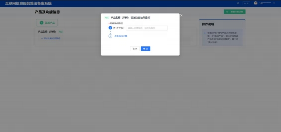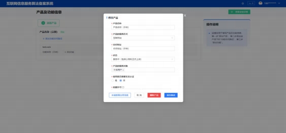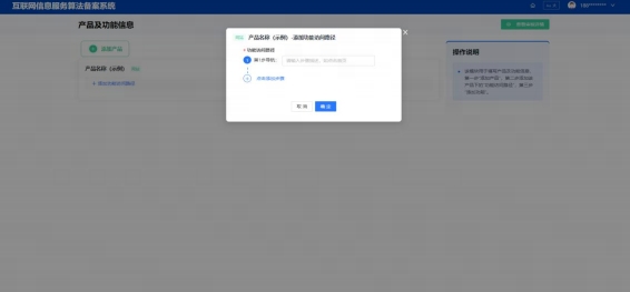 完成主体信息填报后,算法备案填报人员需点击主页的“产品及功能信息”,进行产品及功能信息填报。需依次添加产品信息、产品功能访问路径以及路径下的功能信息。添加时需参考页面右方的说明文字,根据实际情况进行填报。