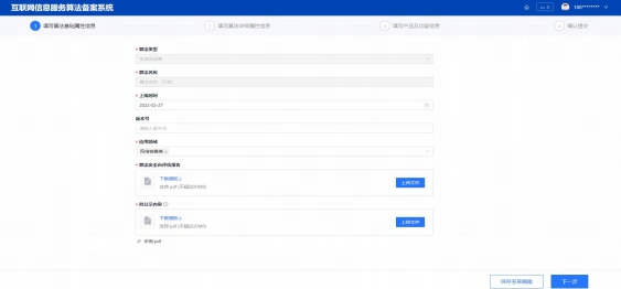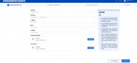 1.填写算法基础属性信息:需按照页面右方的说明文字,真实准确地填写算法信息,包括算法类型、应用领域等。同时,还需下载并填写《算法安全自评估报告》和《拟公示内容》附件。