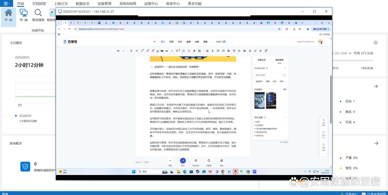 安固软件是一款专为现代企业设计的电脑监控解决方案,它集实时监控、行为分析、上网管理、文件监控、远程协助等功能于一体,满足企业对员工电脑全方位监控的需求。