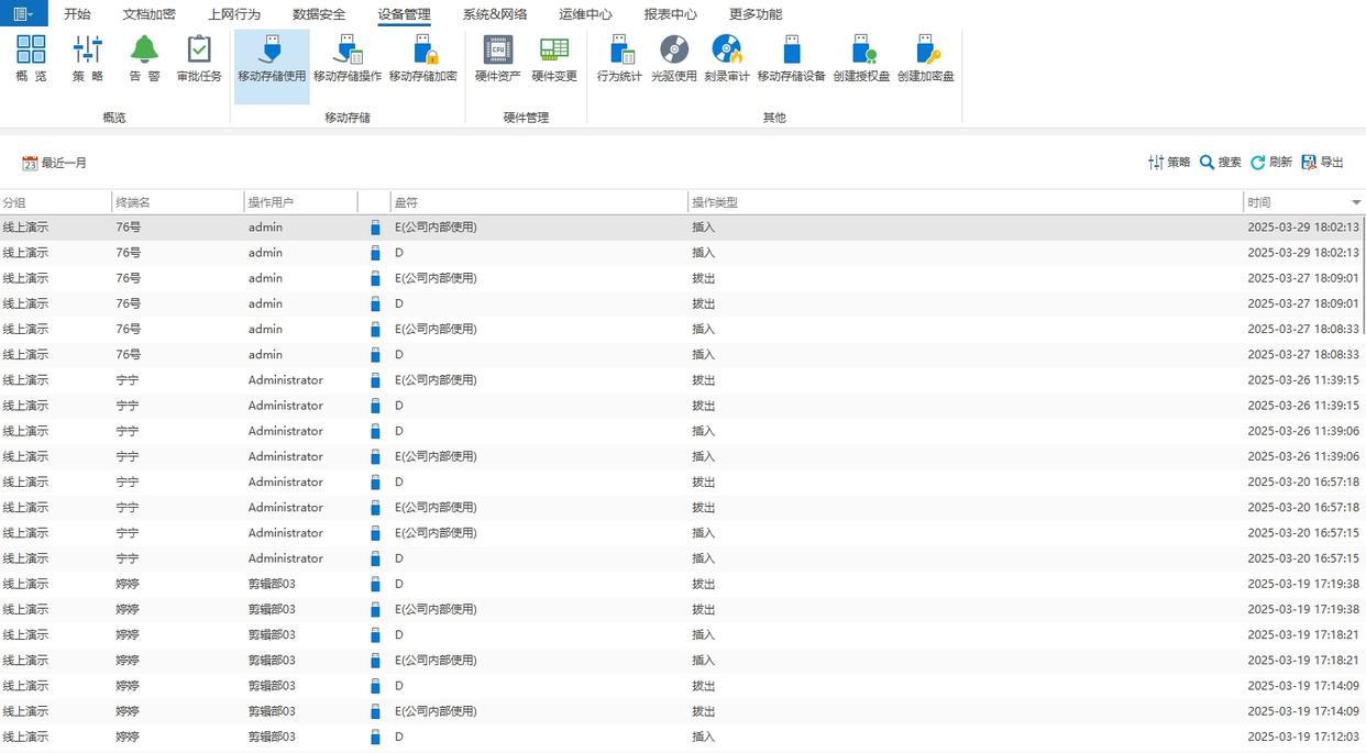 移动存储监控:能自动记录终端计算机上移动存储设备(比如 U 盘、移动硬盘)的插拔操作。方便企业随时查看。